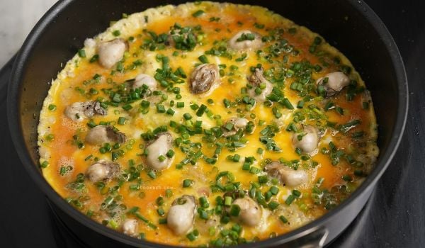 • Dàn đều hàu ra khắp chảo, đổ bát trứng dàn đều vào, chiên 3 – 5 phút là chín.